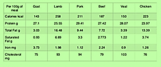 Dari hasil penelusuran dapat disimpulkan bahwa dibandingkan dengan daging sapi, babi, domba dan ayam, daging kambing memiliki nilai kalori yang lebih rendah, mengandung protein dan zat besi yang lebih tinggi yang mebuat daging kambing dikategorikan sebagai “lean meat” yang bermanfaat bagi kesehatan.