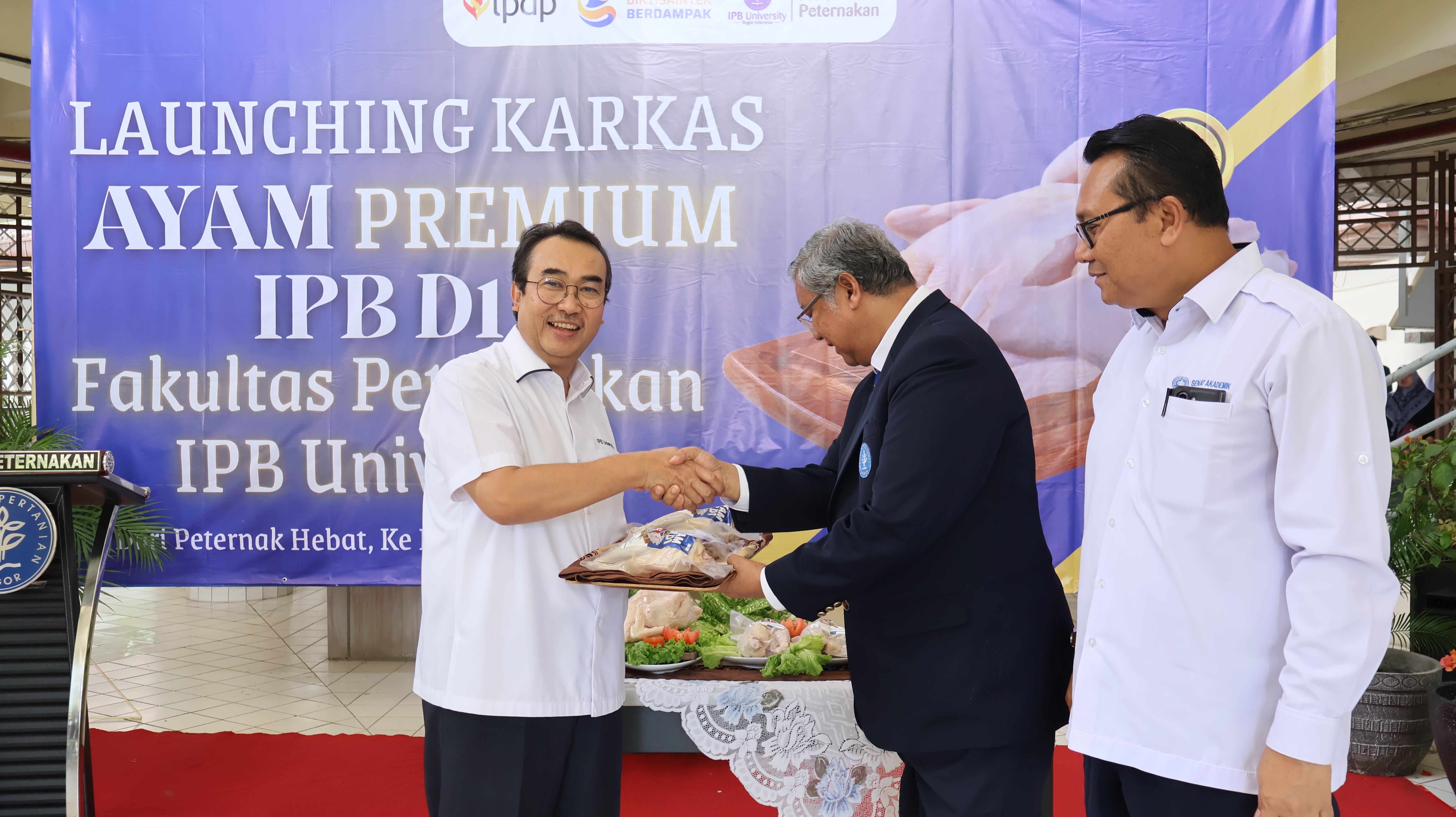 Launching karkas daging ayam IPB D1 diresmikan secara langsung oleh Wakil Rektor Riset, Inovasi, dan Pengembangan Masyarakat Agromaritim Prof. Ernan Rustiadi (WR 3) dan secara simbolis dilakukan dengan penyerahan karkas ayam oleh Prof. Cece Sumantri selaku inovator kepada Prof. Ernan Rustiadi serta disaksikan oleh Direktur DRI dan Dekan Fapet.