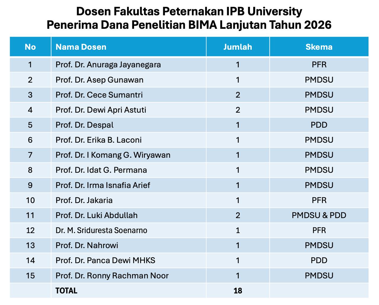 Fakultas Peternakan IPB University kembali mencatat prestasi membanggakan di bidang penelitian. Para dosen dari Departemen Ilmu Produksi dan Teknologi Peternakan (IPTP) serta Departemen Ilmu Nutrisi dan Teknologi Pakan (INTP) berhasil memperoleh 18 pendanaan Hibah Penelitian BIMA Lanjutan Tahun 2026, kelanjutan dari proposal yang diajukan pada 2025.